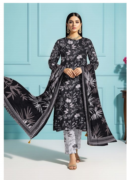 Embrace timeless elegance with this black 3-piece unstitched lawn suit, featuring delicate floral prints in soft grey and white tones for a sophisticated yet classic appeal. The contrasting white printed trouser and beautifully bordered dupatta complete the look with a graceful finish.