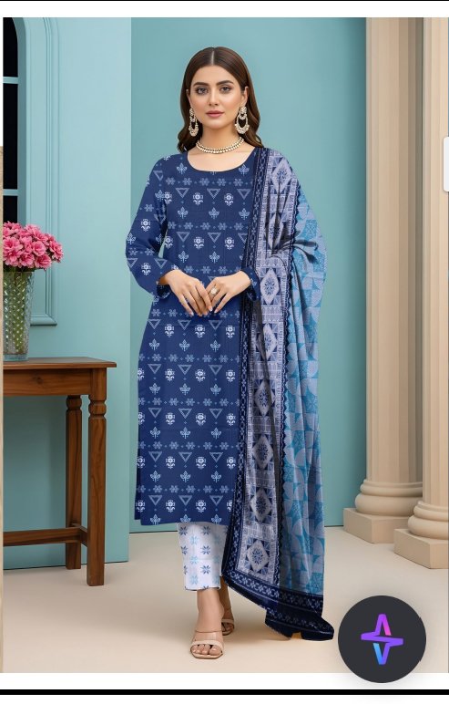 Radiate elegance with this navy blue 3-piece unstitched lawn suit, featuring intricate white geometric and floral patterns for a refined traditional look. The printed trouser in soft blue tones and the beautifully coordinated dupatta with bold patterns complete the outfit with a graceful touch.