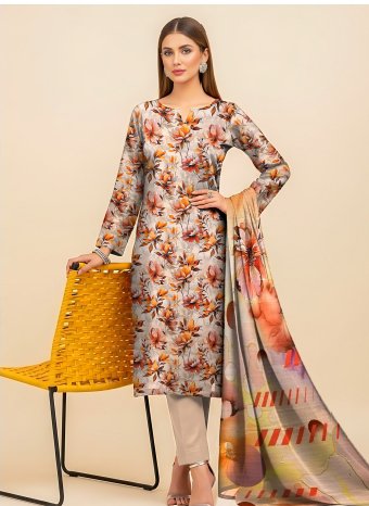 Upgrade your wardrobe with this stylish slub linen 3-piece suit, featuring a beautiful beige base adorned with warm autumn floral prints in shades of orange, rust, and brown. The look is enhanced with a vibrant digital printed dupatta and solid dyed trouser, creating a perfect blend of elegance and comfort.