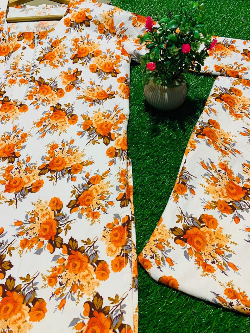 Brighten up your winter days with this stunning white khaddar suit, beautifully adorned with orange and mustard floral prints. Made from premium soft winter khaddar, this outfit combines warmth, comfort, and timeless elegance — perfect for both casual and semi-formal occasions.