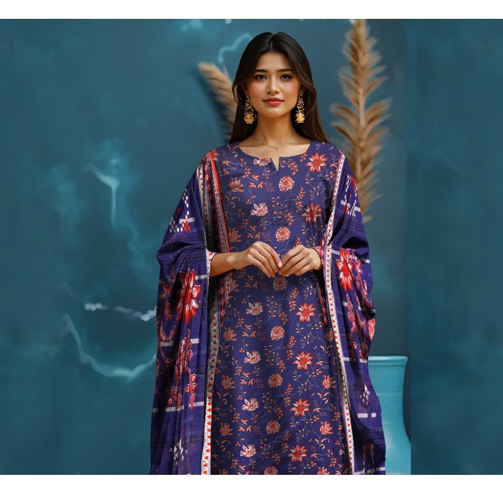 Add a touch of elegance and sophistication to your wardrobe with this deep purple floral printed 3-piece lawn suit. The shirt features charming red and pink floral motifs that beautifully stand out on the rich purple base, creating a refined and feminine look. It comes with a matching printed dupatta showcasing vibrant floral and geometric patterns and plain trousers to complete the ensemble with grace.